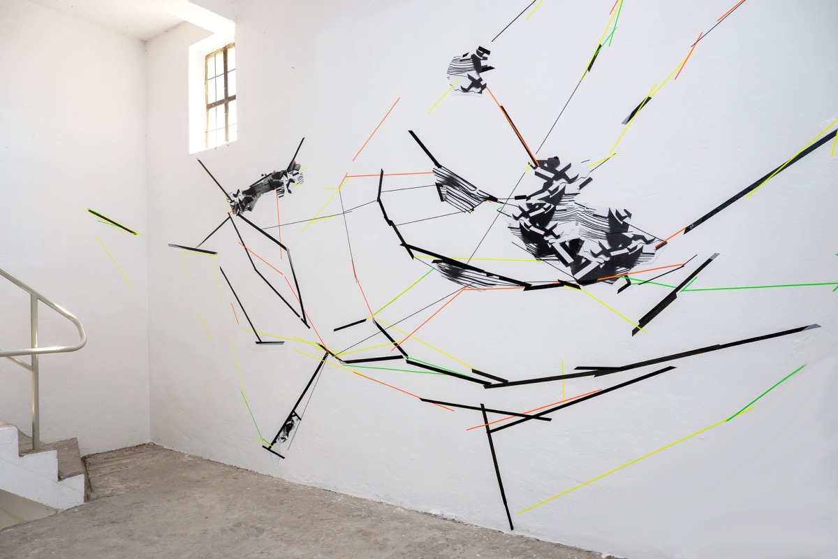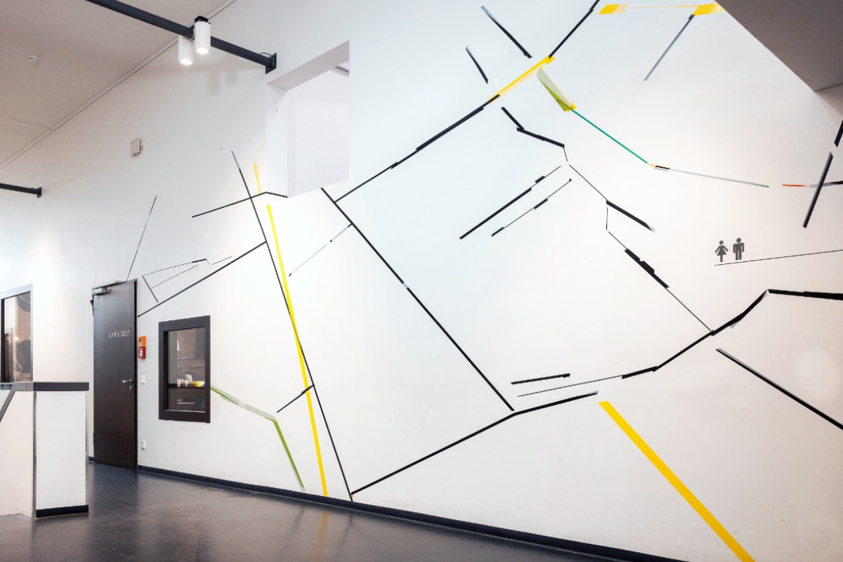 Im Rahmen des Karl-Hofer Stipendiums erhielt Alexandra Schlund ein dreimonatiges Arbeitsstipendiums der Firma Interroll in der Schweiz. Das Atelier befand sich in St. Antonino im Tessin. Vor Ort fertigte die Künstlerin zahlreiche Zeichnungen der Umgebung an, insbesondere mit Filzstift, Edding und Lineal. Mittels der Klebetechnik mit Tape vermochte es Alexandra Schlund, die besondere Ästhetik der Filzstiftzeichnung stringent auf die großflächige Wand zu übertragen. Foto: Alexandra Schlund