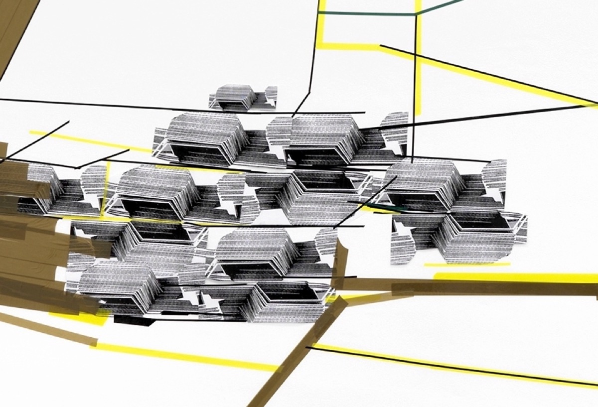 Cluster, Wandarbeit aus Klebebändern, Folien und Papier,