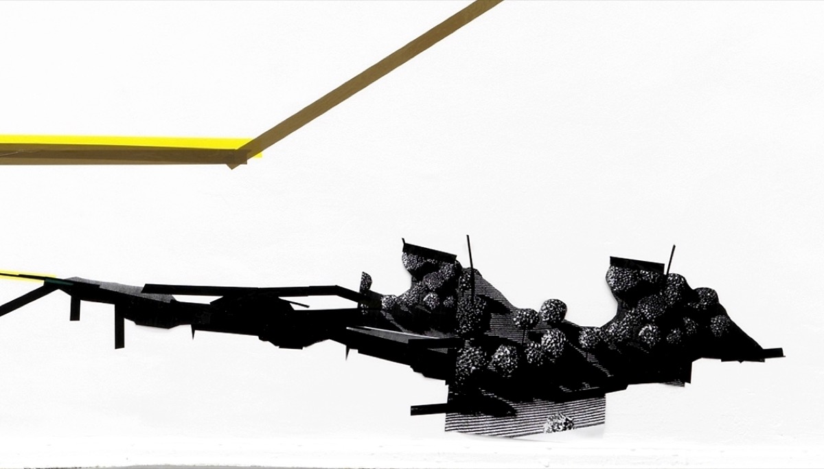 Im Rahmen des Karl-Hofer Stipendiums erhielt Alexandra Schlund ein dreimonatiges Arbeitsstipendiums der Firma Interroll in der Schweiz. Das Atelier befand sich in St. Antonino im Tessin. Vor Ort fertigte die Künstlerin zahlreiche Zeichnungen der Umgebung an, insbesondere mit Filzstift, Edding und Lineal. Mittels der Klebetechnik mit Tape vermochte es Alexandra Schlund, die besondere Ästhetik der Filzstiftzeichnung stringent auf die großflächige Wand zu übertragen. Foto: Alexandra Schlund